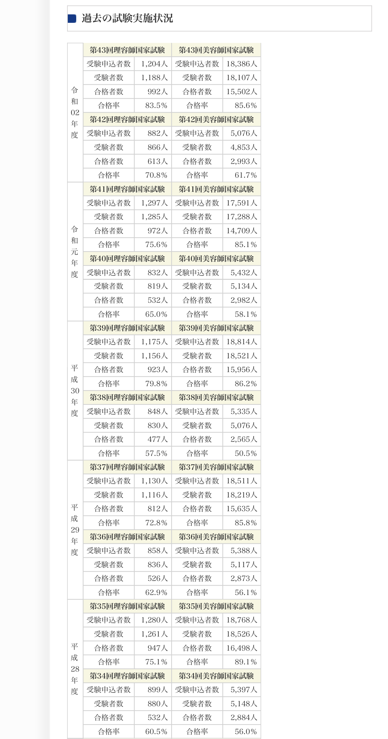 上が過去5年間の理美容師国家試験における受験者と合格者のデータです。
