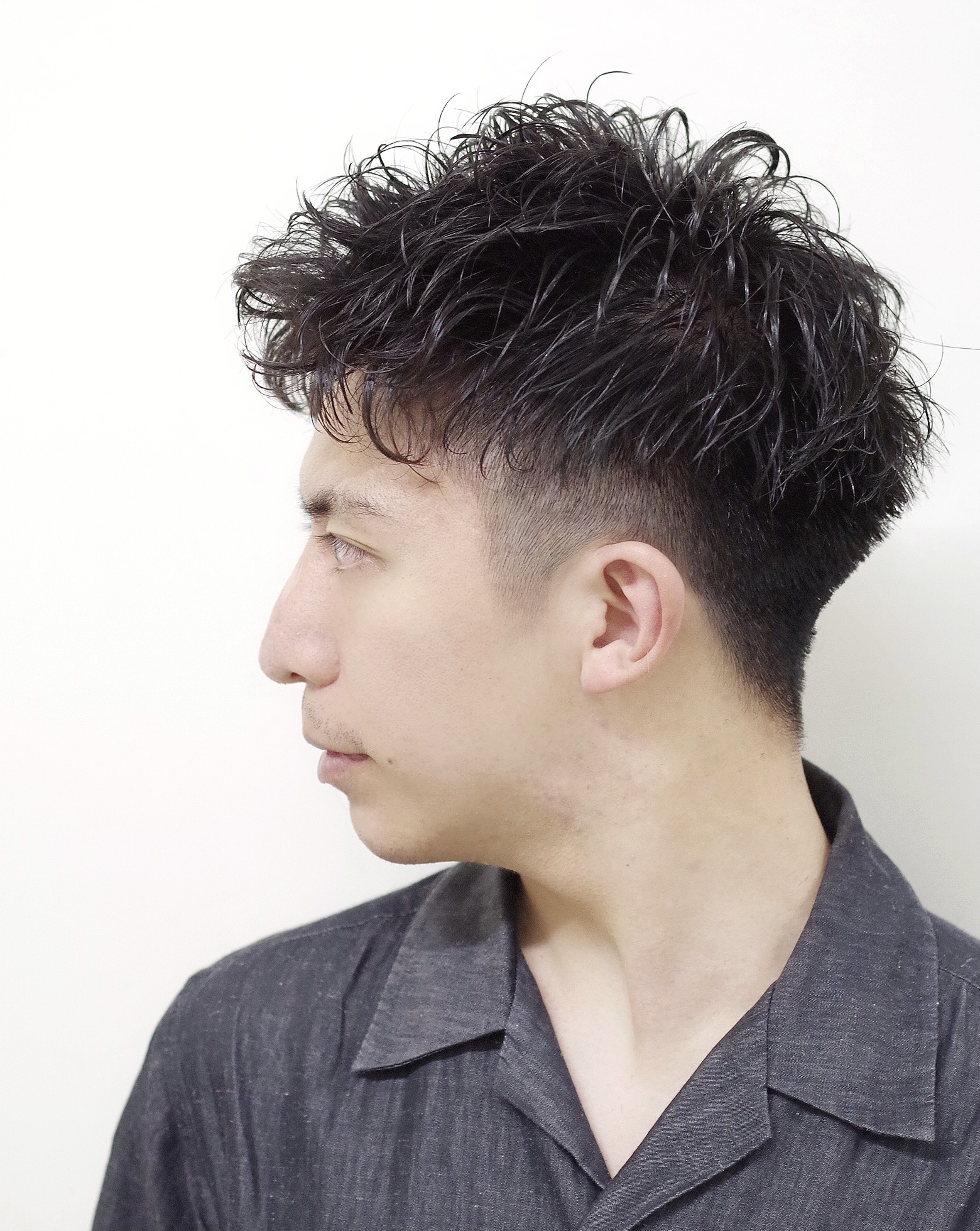 ツーブロック×緩めスパイラルサイドは6mmからのグラデーション、バックは後頭部にボリュームを残すようにカット。緩めのツイストスパイラルパーマで、少しワイルドなやり過ぎない男らしいスタイルです。