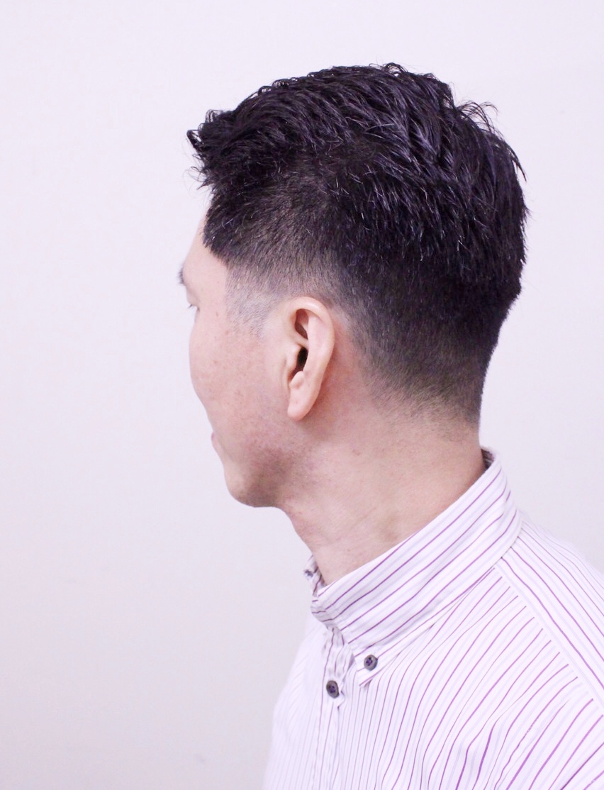 サイドかかなり張るからといって上まで刈り上げ過ぎずに、その分すそ周りは短くした七三フェードスタイル。七三もすそ周りを短いフェードにする事で現代的な漢らしいスタイルに