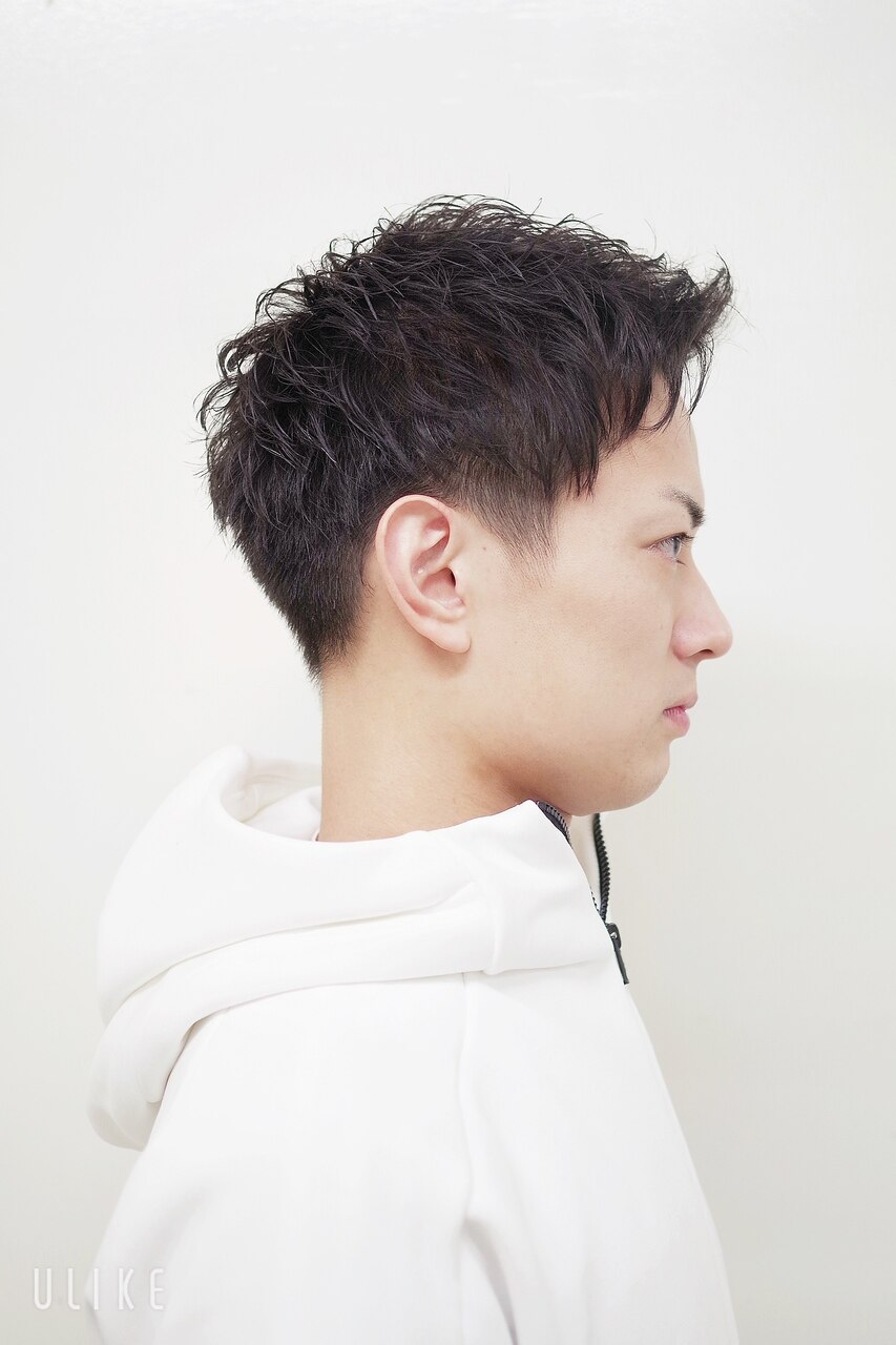 ツーブロックのアップバングスタイルにアイロンパーマをかけることでセット、アレンジが簡単に。サイドのツーブロックを厚めに刈り上げる事で、正面から見てくびれすぎないようにした少し落ち着きのある仕上がりです。