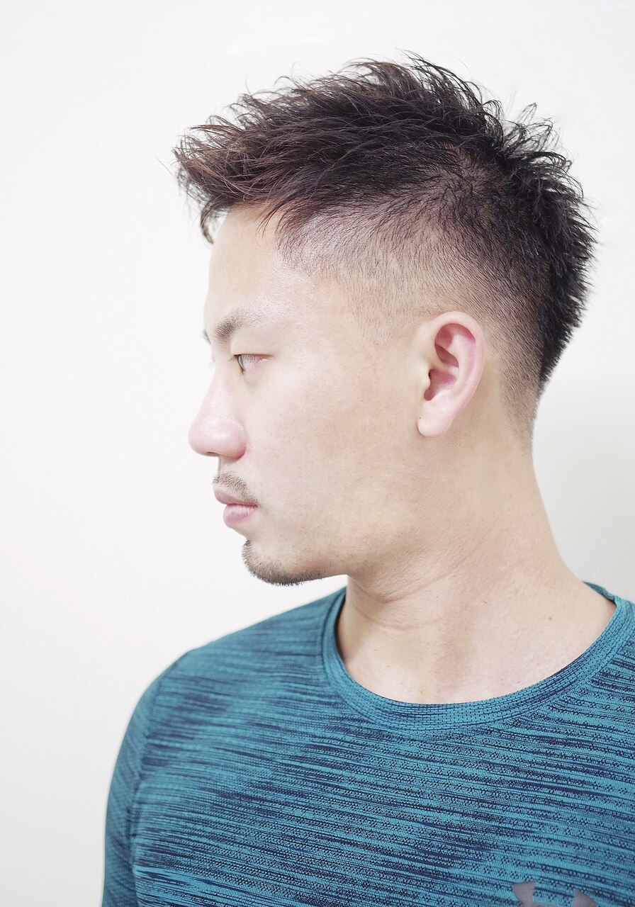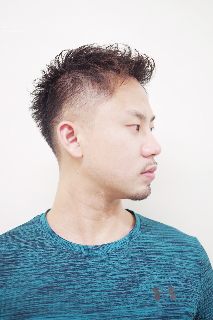 直毛のモデルさんですが、フェードスタイルにアイロンパーマを組み合わせることで短髪でありながら動きのあるスタイルを実現。スタイリングも楽になります。
