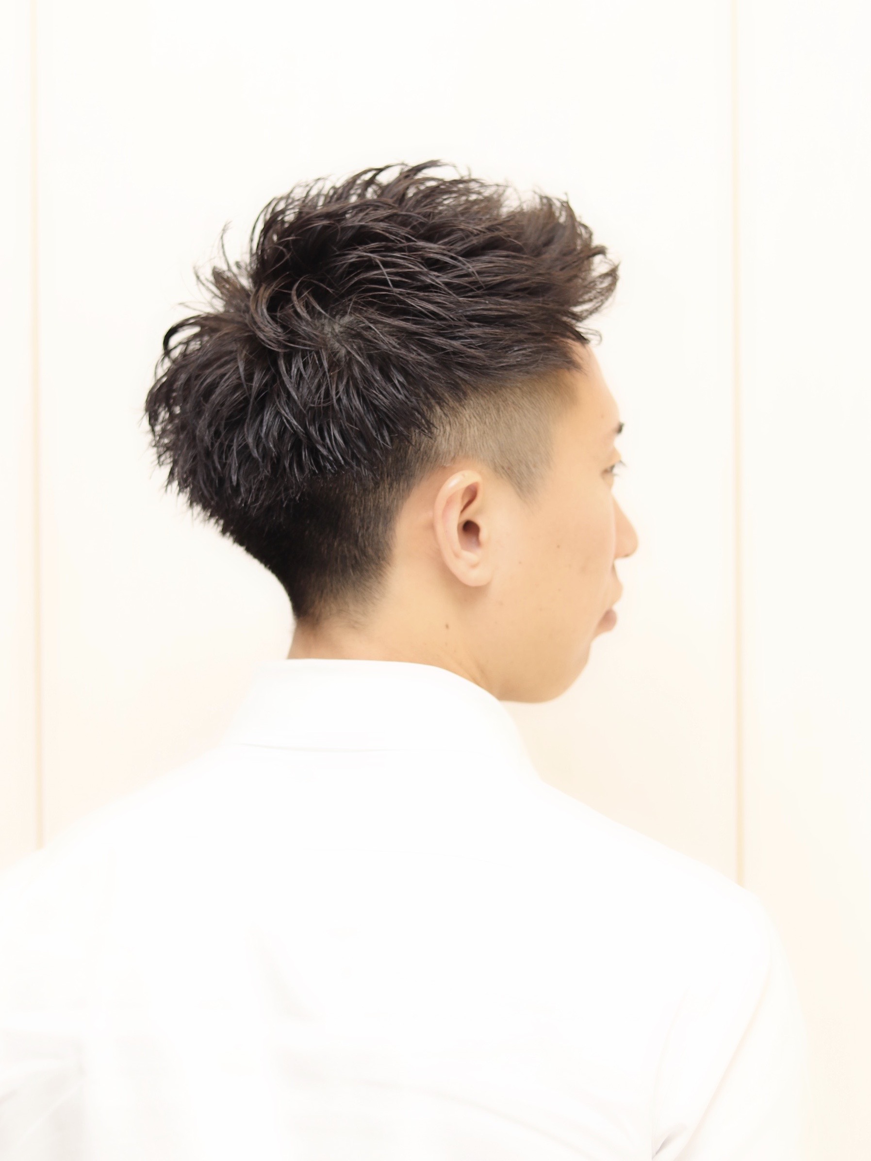 横と後ろをスッキリと刈り上げてトップはアイロンパーマをかけて動きを出しています!直毛の方でもアイロンパーマをかけることでゆるいカールで動きの出しやすい仕上がりになります!