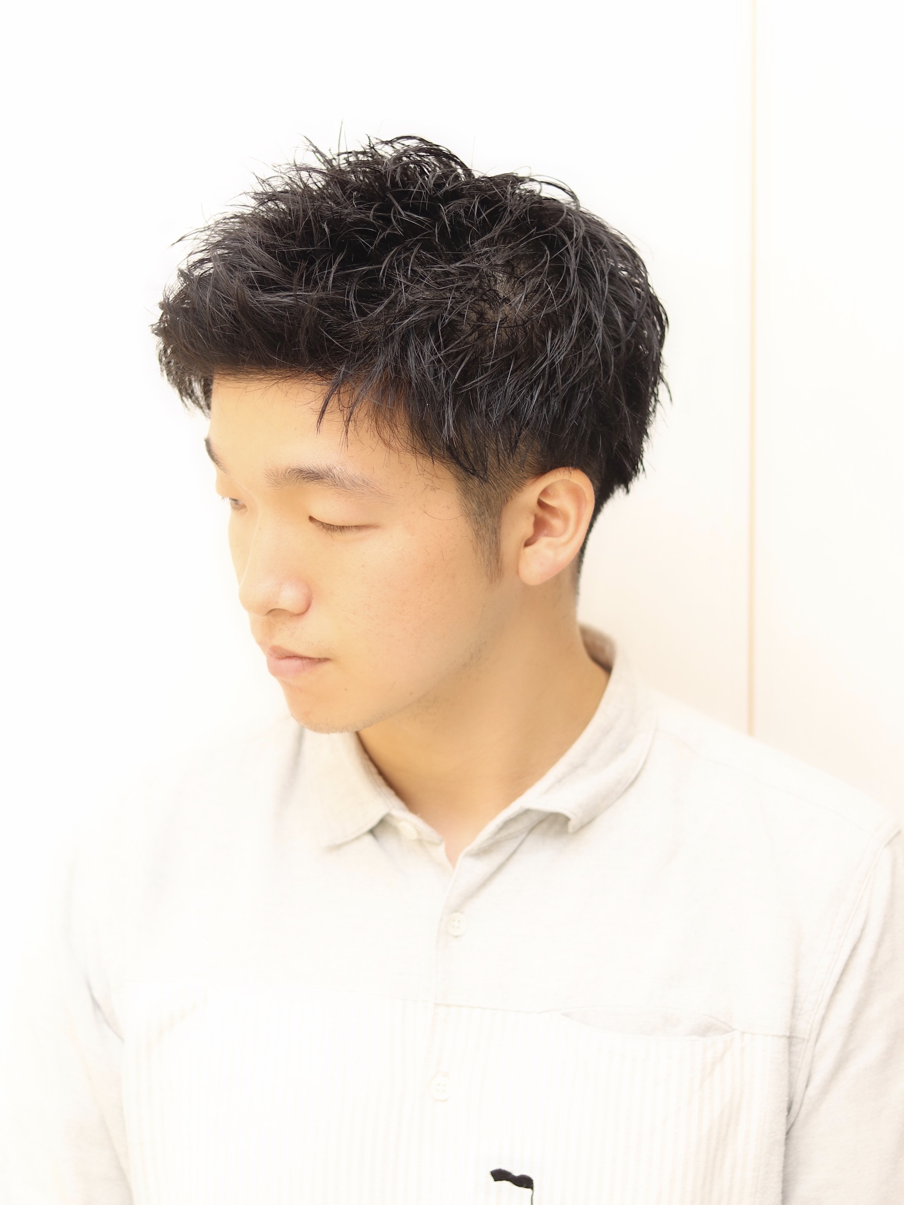 アイロンでパーマをかけて自然なくせ毛風パーマです!カールがあまり強くないため規則の厳しい学校や職場にも対応できます!ツーブロックと後ろは刈り上げて今時のヘアスタイルです!