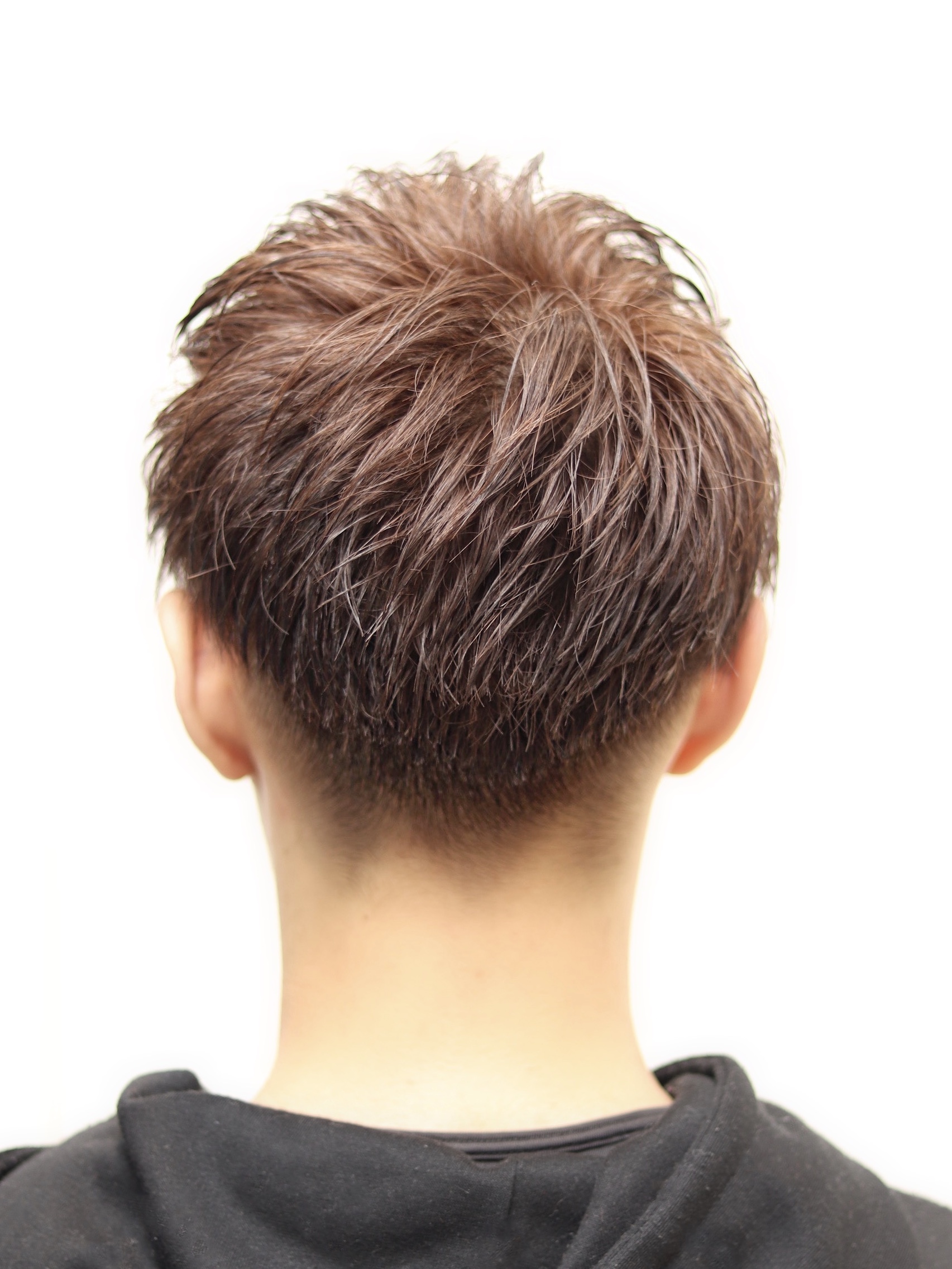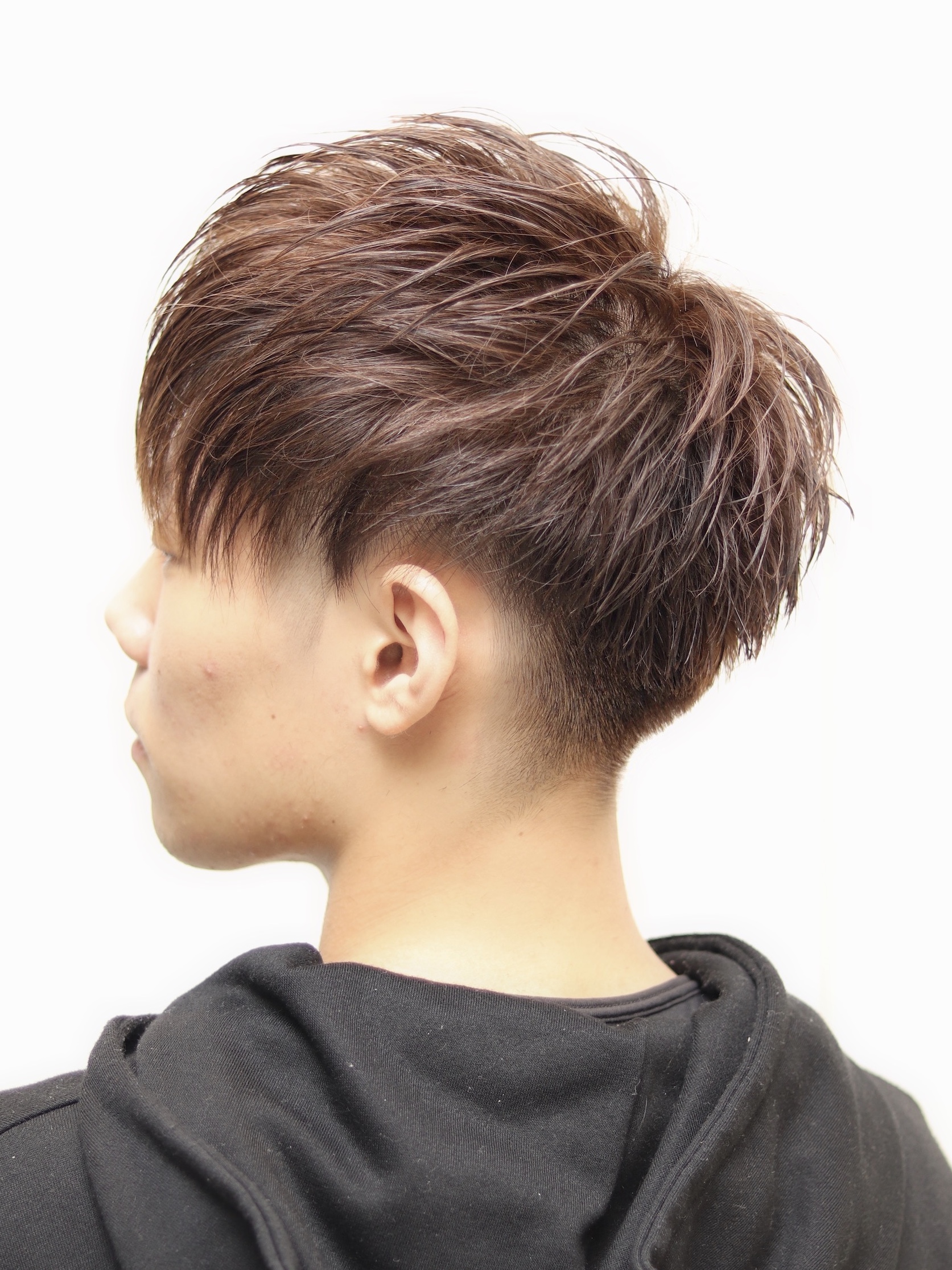 ツーブロック部分、後ろは少し高めに刈り上げて前髪を長めに残すことで前下がり風にしてみました!明るめの茶色を入れる事でさりげないお洒落感も出しています♪