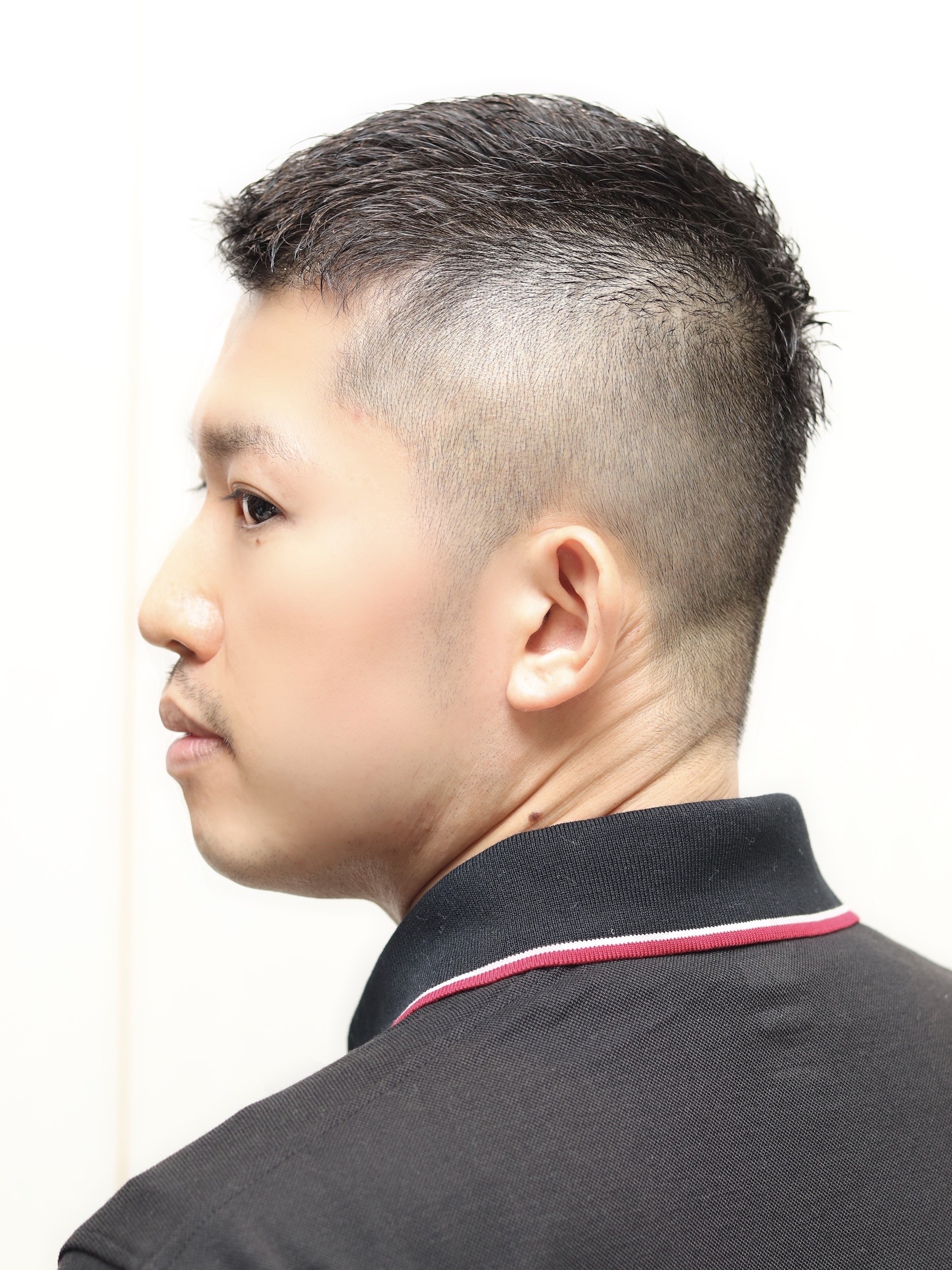 ハチ周りまでバリカン3mを入れて上は少し長さを残したモヒカンスタイルです!横の膨らみがが気になる方で短くするのに抵抗がない方はオススメのヘアスタイルとなっております♪