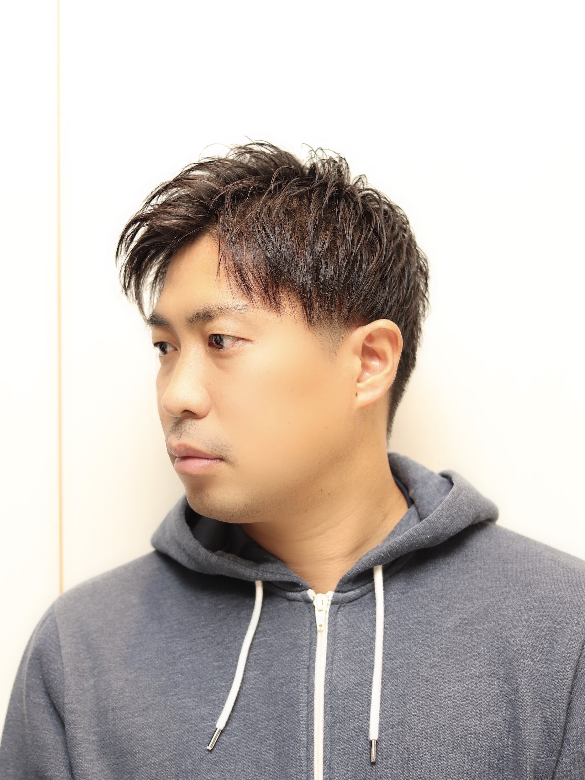 ツーブロックで耳を出してとても清潔感のあるスタイルとなっております!襟足もスッキリと刈り上げてスーツにも似合います♪