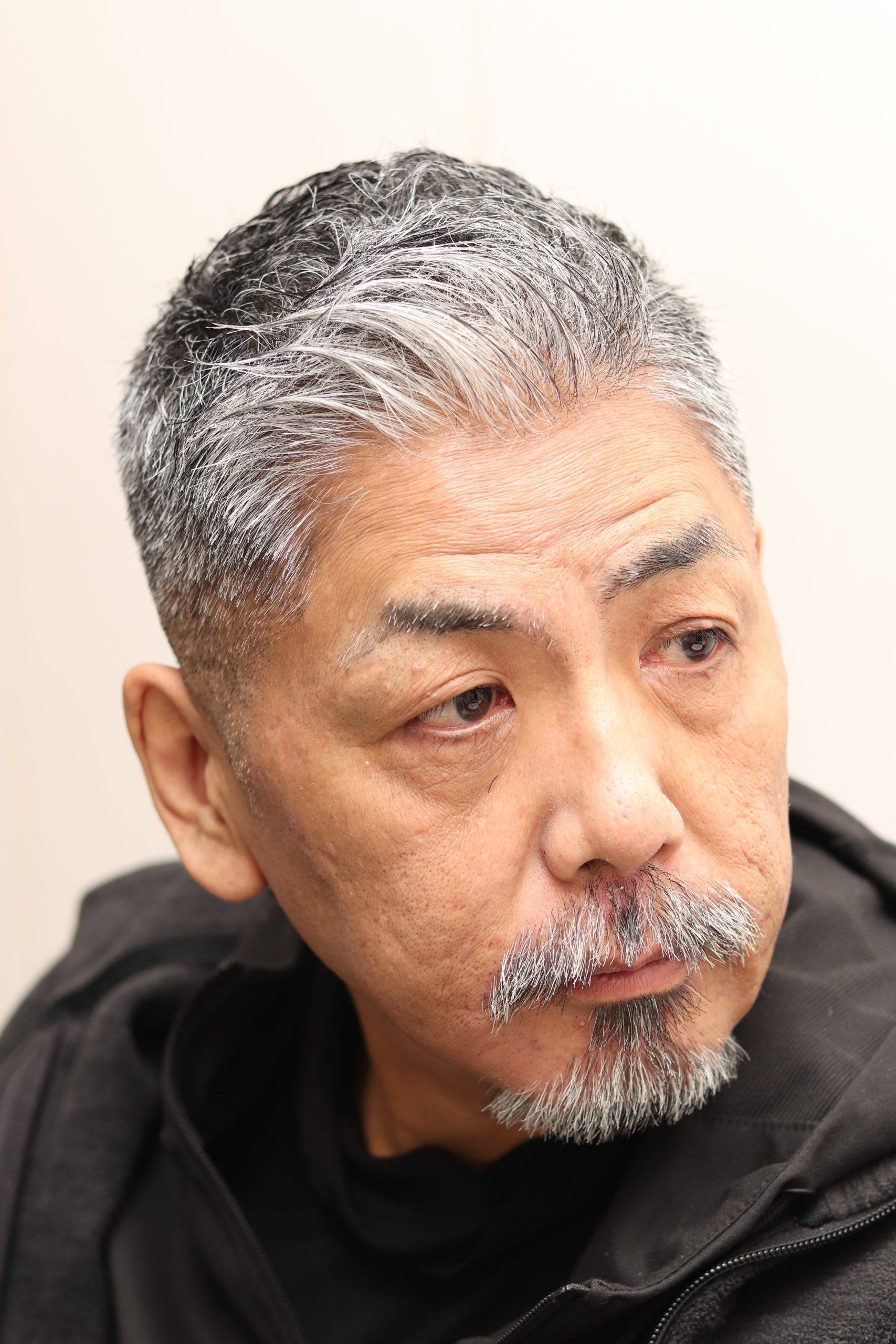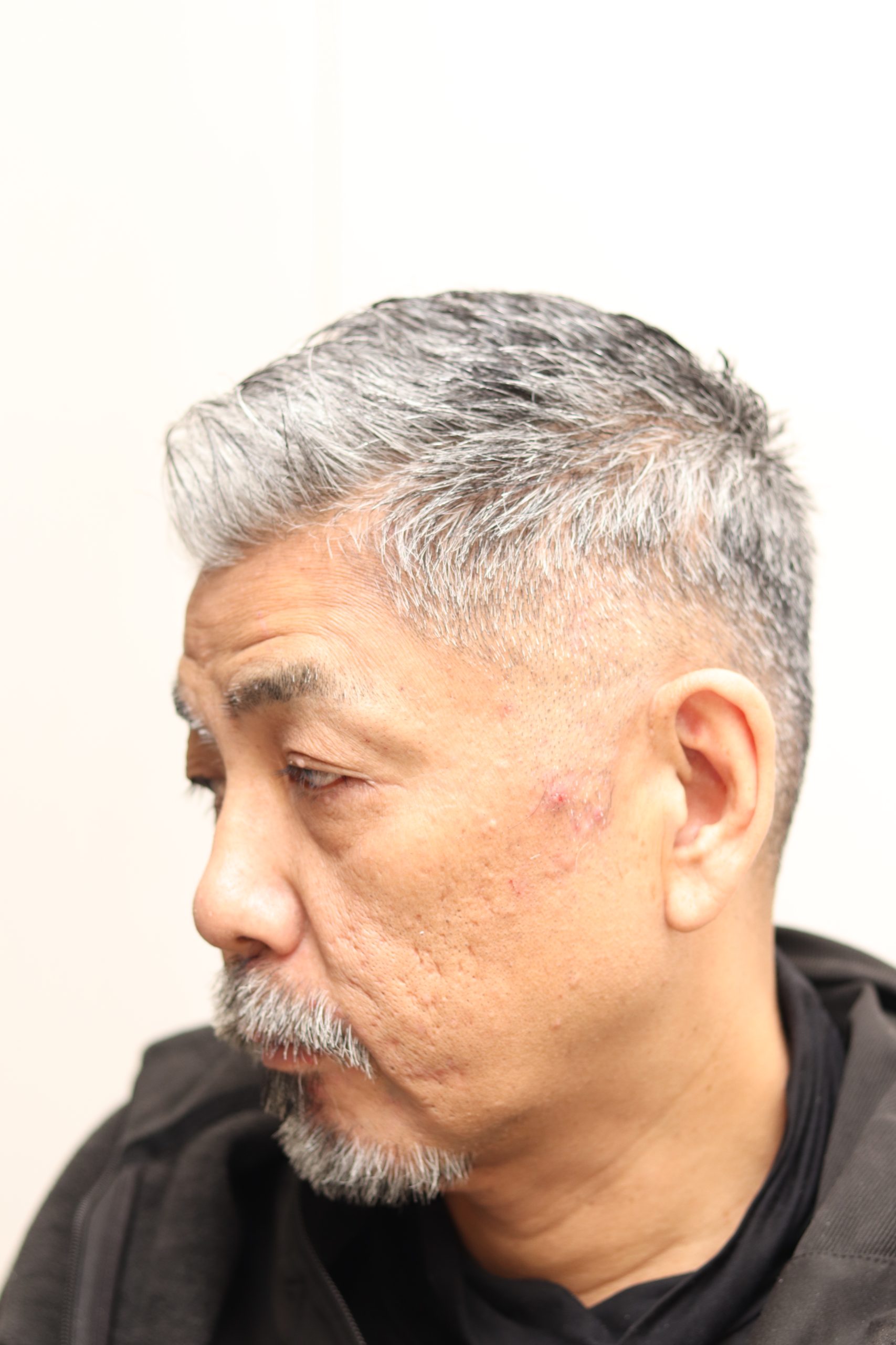 ヒゲに似合う刈り上げショートスタイルです。前髪を立ち上げて爽やな印象を出します。