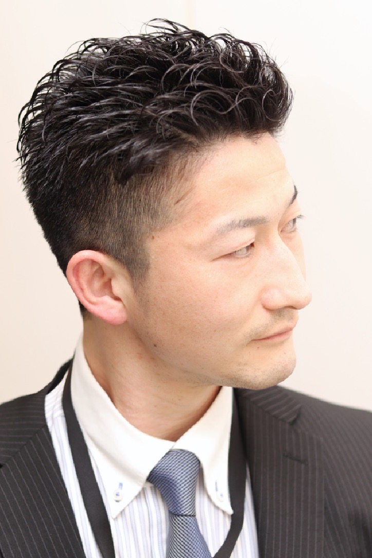 サイドは短く刈り上げてトップはアップバングで後ろに流してます。ビジネスマンにもピッタリスタイル。パーマをかけているのでスタイリングが簡単です。