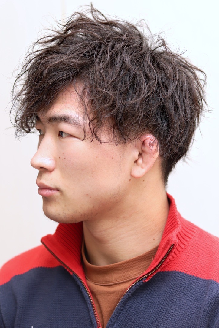 ツーブロックスタイルに強くパーマをかけたチリチリスタイル