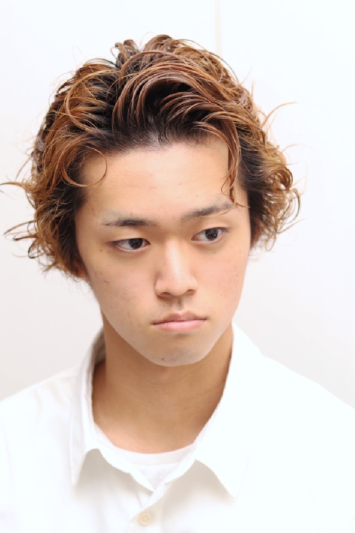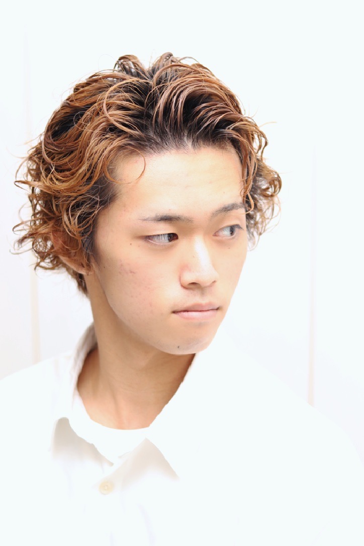 スパイラルパーマをかけて後ろに流しやすいようにしました。マイキー風バックスタイルでも、センターパートスタイルでもどちらでもいけます。