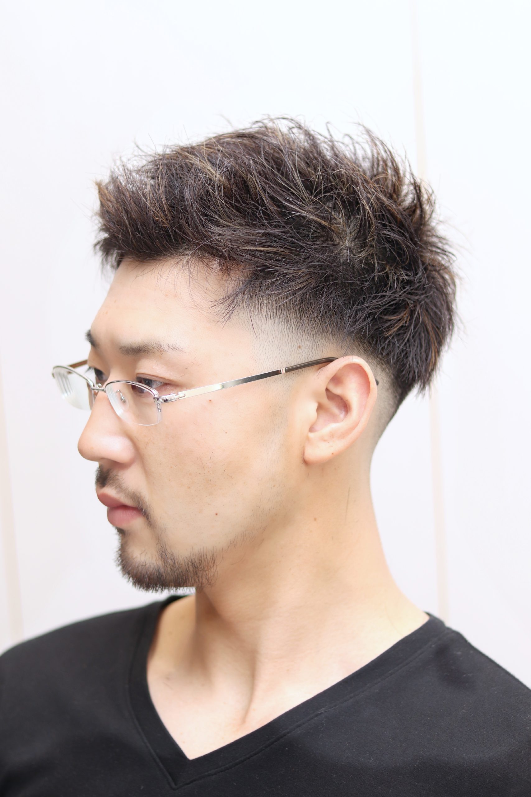 ツーブロックの刈り上げ部分をフェードにした男らしいスタイルです。アップバングで爽やかさもアップ!!