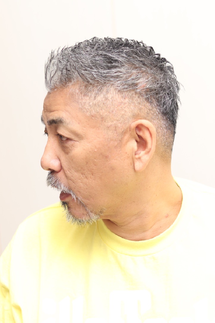 コンパクトに収まるベリーショートツーブロックスタイルです。前髪を立ち上げてダンディに仕上げております。