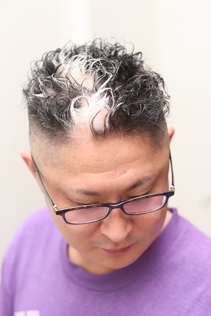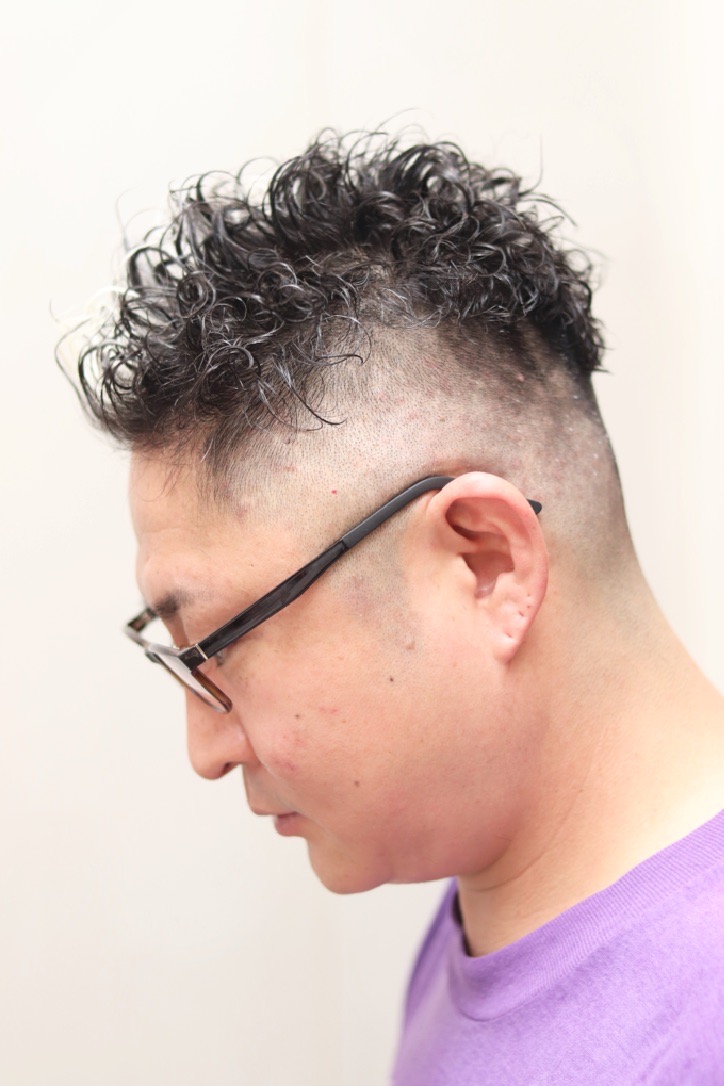 高く刈り上げたフェードツーブロックスタイルで、トップも短くしつつパーマをかけたハードなスタイルです。