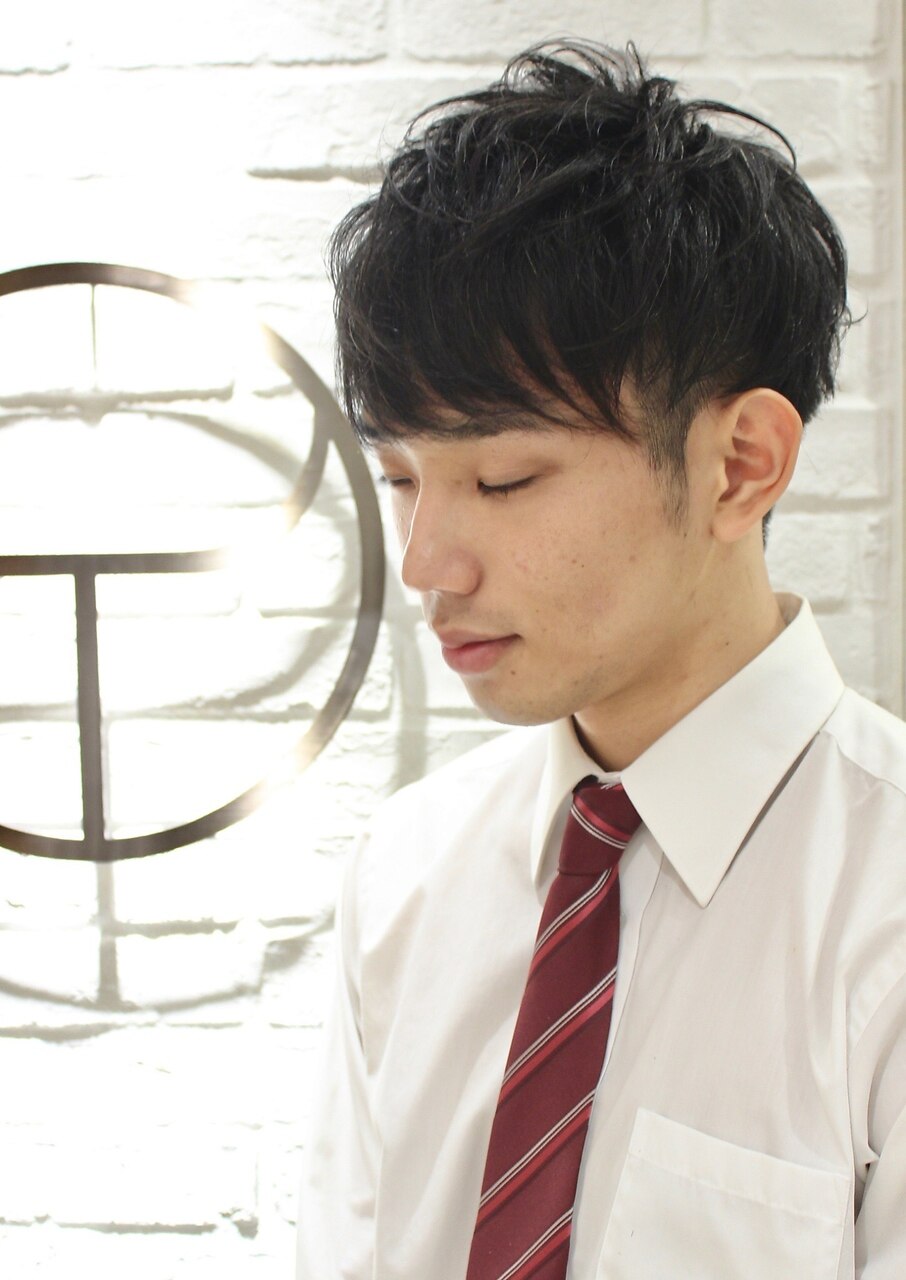 - 毛流れハンサムショートツーブロックパーマメンズ黒髪爽やか