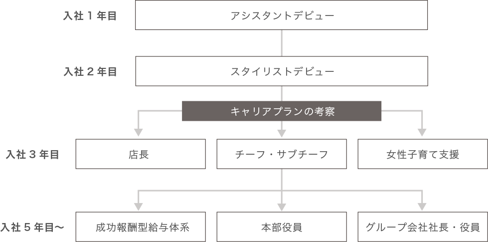 ずっと輝き続けるためのキャリアプランがあります!「理容師として働き続けたいし、子供も産みたい。」仕事か?女性としても幸せか?どちらかではなく、両方手に入れたい。当社はそんな女性を応援しています。ワーク・ライフ・バランスを重視し、出産・育児をしながら女性が長く働ける「キャリアプラン」をご用意しています。そのため育児休暇後も自分のペースに合わせて現場に復帰することが可能です!
