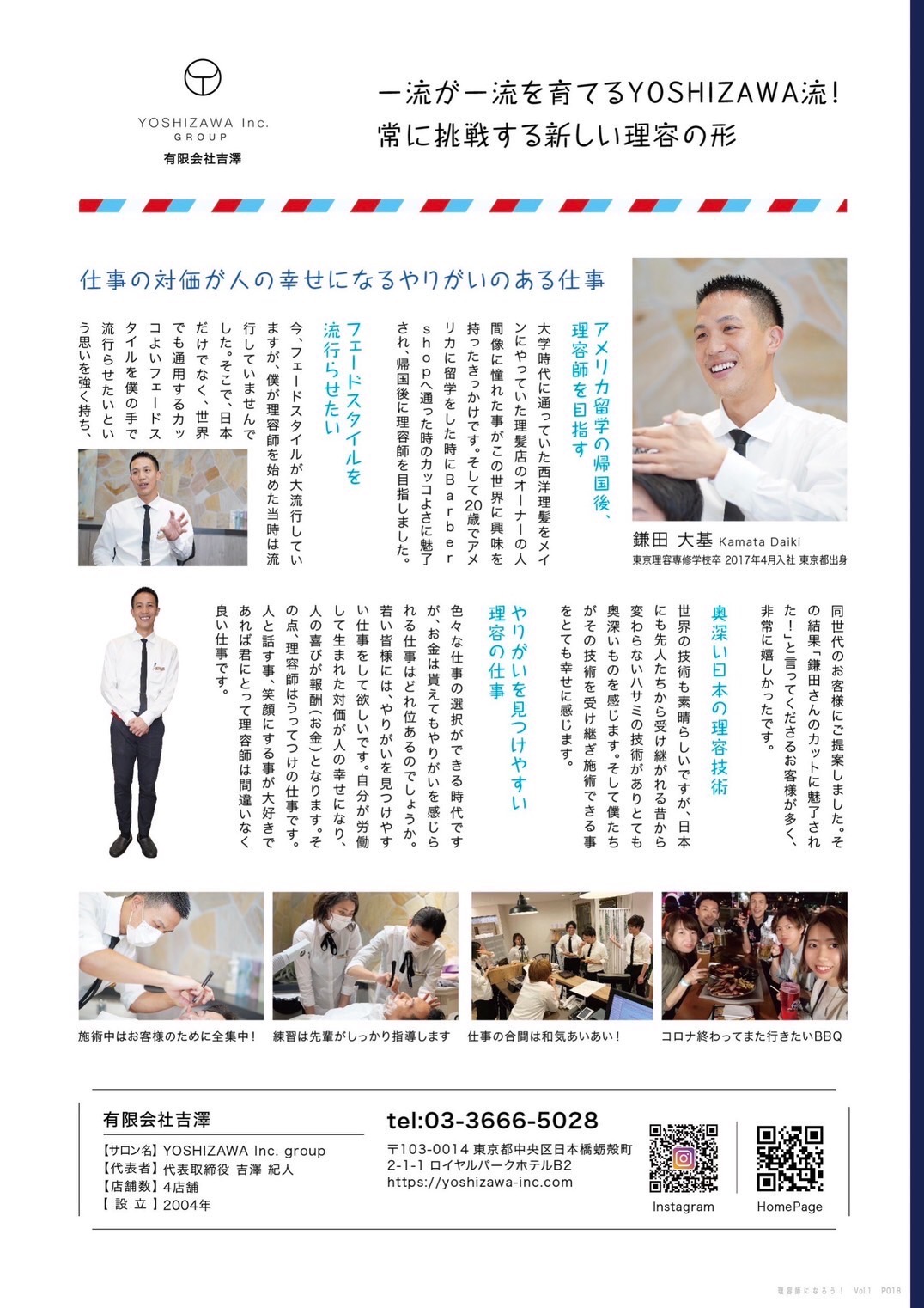ドキドキしながらワクワクできる。真似できない一流の立地で一流のコラボレーション。そんな仕事であればとても楽しいです。仕事は、好きにならなくては上手くなりません。そして、一流の誇りとプライドはみなさんを大きく成長させます。世界に誇れるクールジャパン理容ブランドYOSHIZAWA Inc.groupの一員として活躍してみませんか。