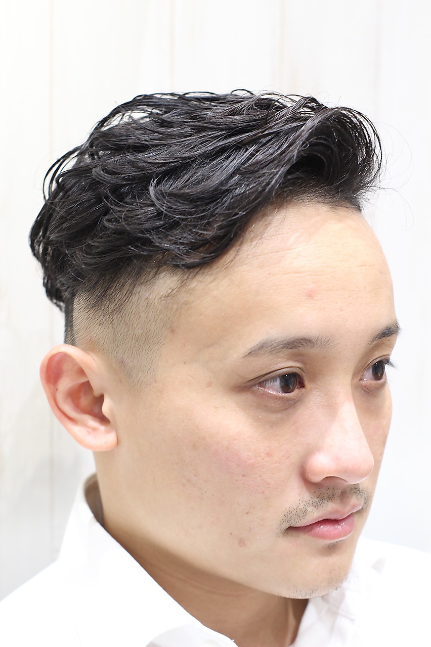 震災刈りスタイルにもっとアクセントを付けてガッツリ短くしませんか?トップのみ長さを残し、パーマで動きをつけ横、後ろはフェードで震災ツーブロックに!!この夏、お客様に一歩先のスタイルを。