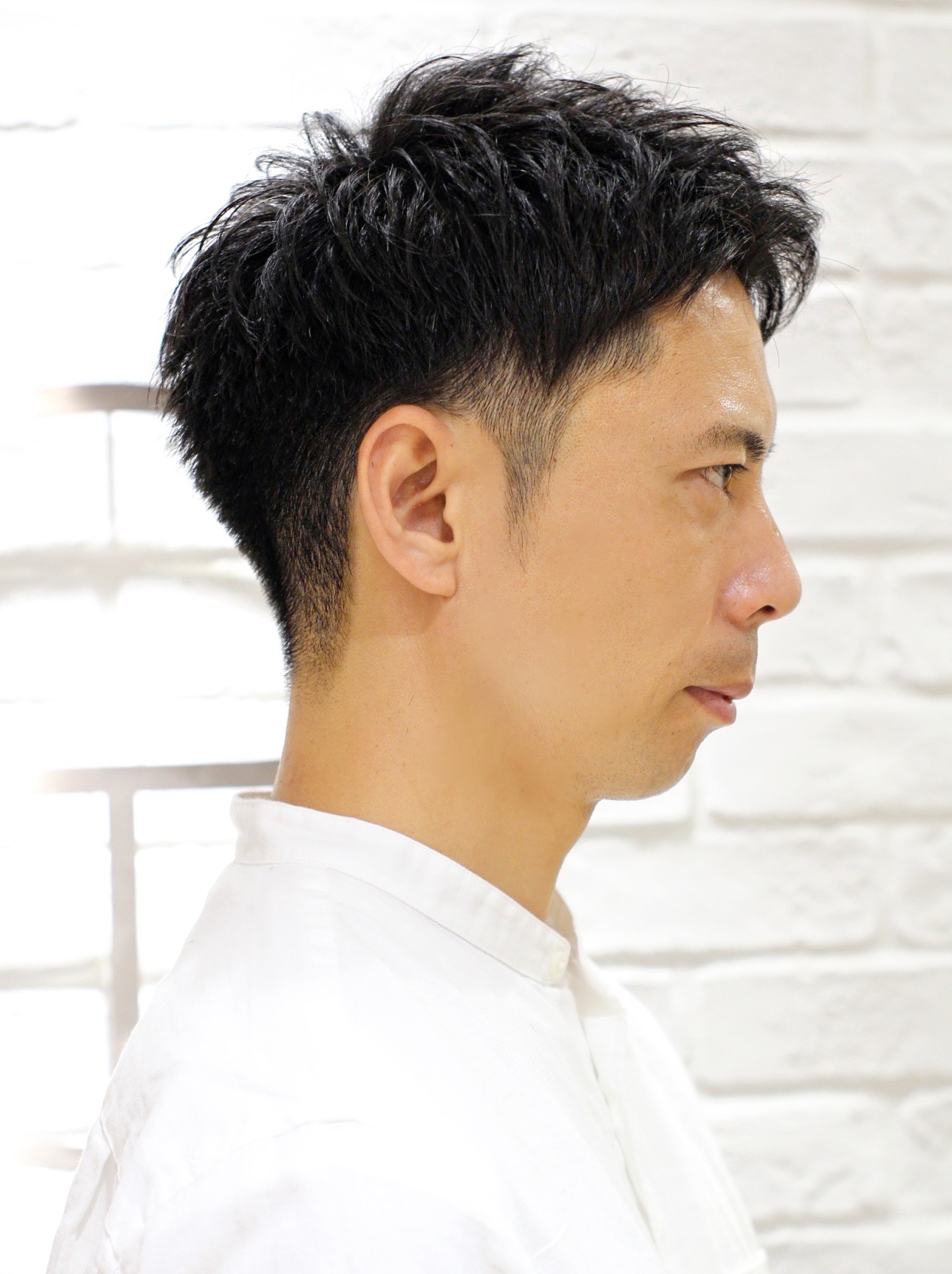 サイドをツーブロック、えりあしを刈り上げた爽やかビジネススタイルです。