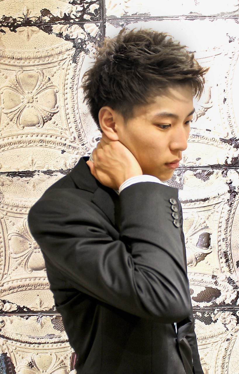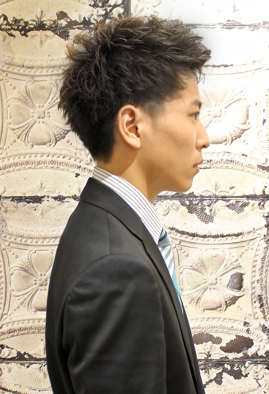 サイドはツーブロックでスッキリ感を。パーマをかけて動きとボリュームを。どなたにでも対応可能の万能スタイルです。サイドから流すようにワックスを揉み込んで。