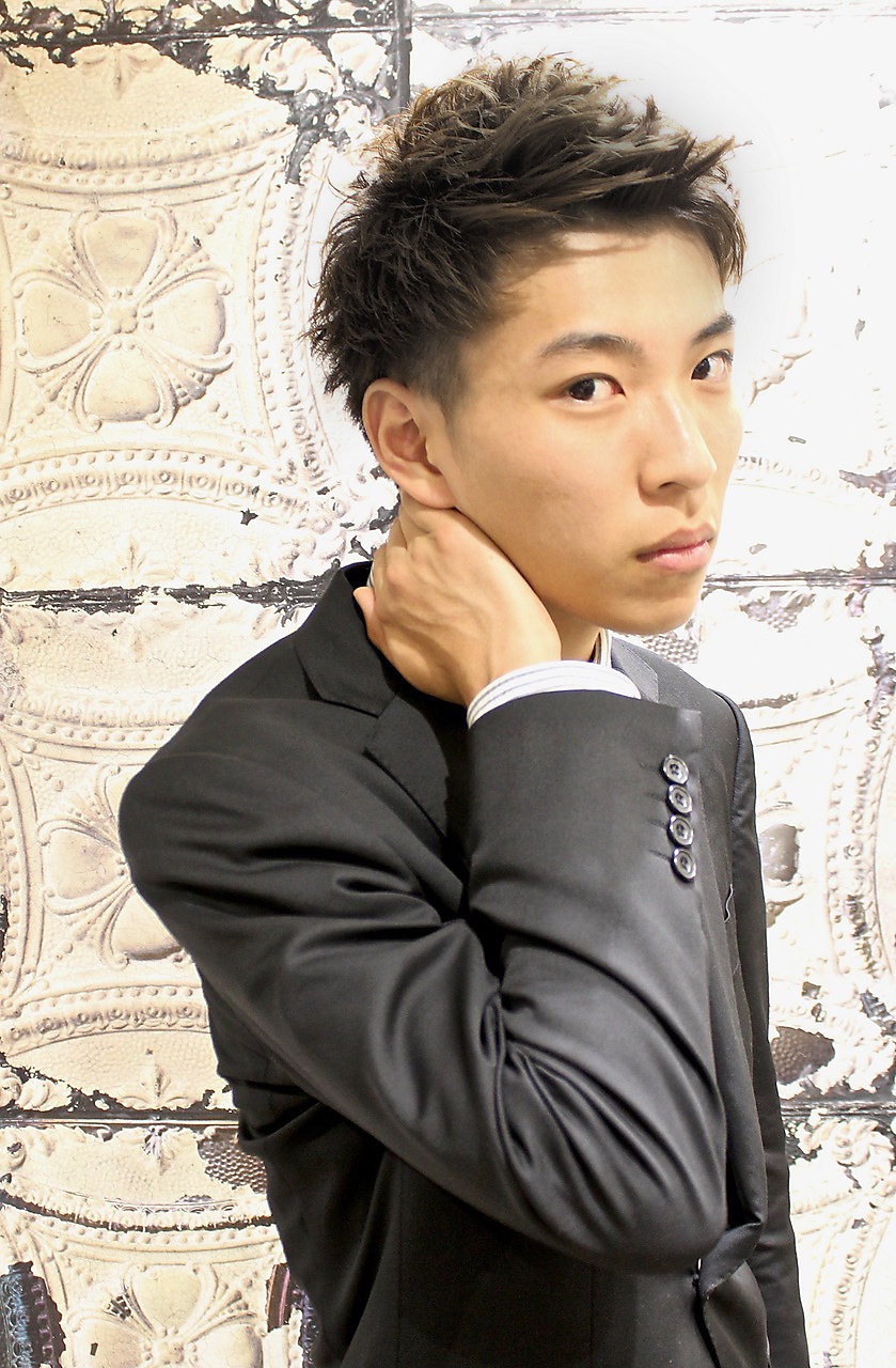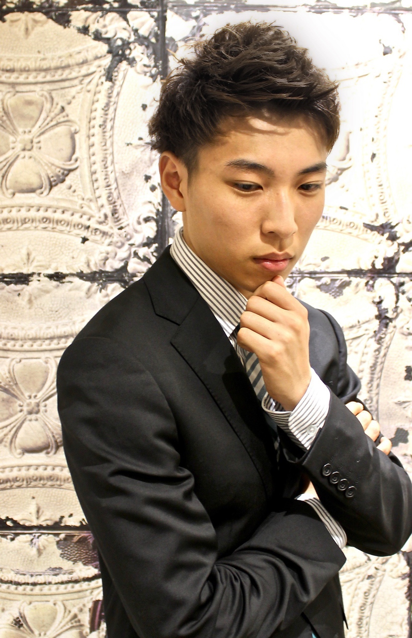 サイドをツーブロックにした、万能スタイル☆全体にワックスを揉み込んで、動きを出すように。