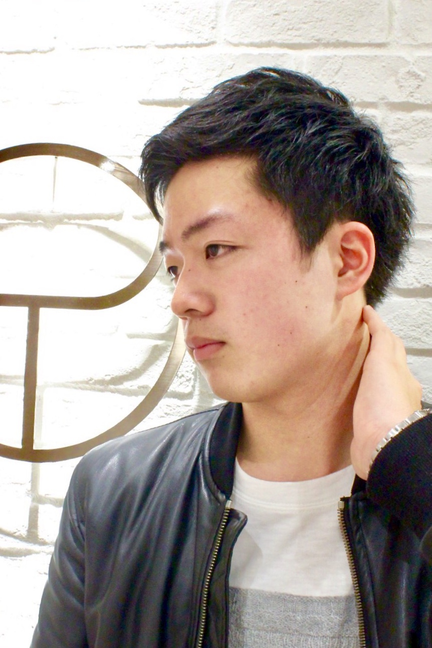 刈り上げないギリギリの長さで、アップバングのしやすいさっぱりとしたシ長めのソフモヒ系スタイル!