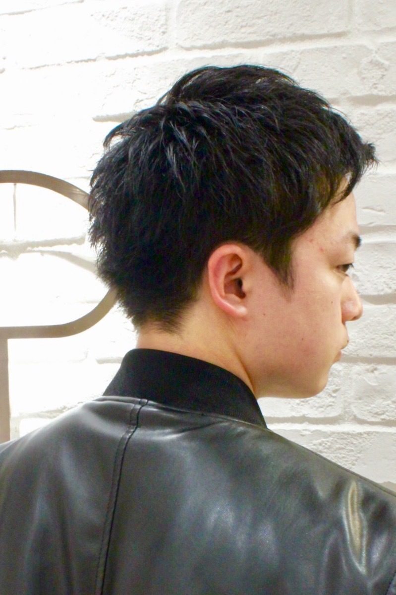 全体的にサイドにフロントだけ立ち上げて乾かし、ワックスを全体になじませ束感を少しつけ完成!!トップをパーマで動きを作ればより立体感もでます!!