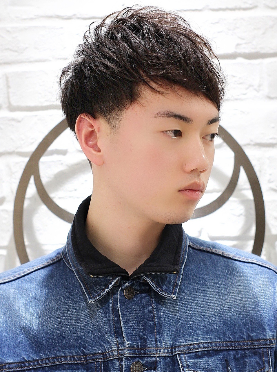 サイドをツーブロック、襟足を刈り上げ、全体にアイロンパーマで動きをつけたショートスタイルです。