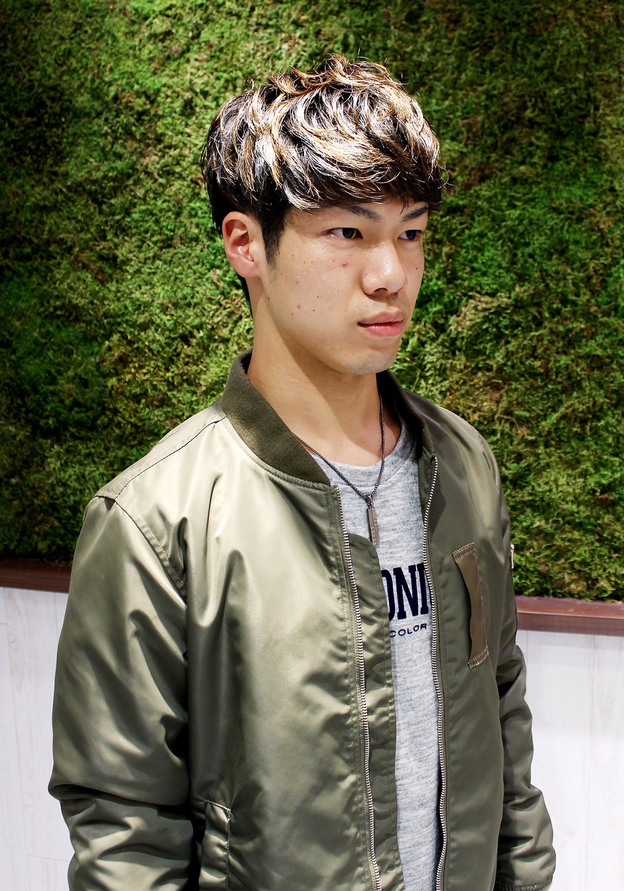 トップのパーマと毛先のハイトーンカラーが重すぎない毛束を作ります。スタイリングはカールを残しながら乾かして、柔らかめのワックスで揉み込み、スプレーで毛束を作って仕上げます。
