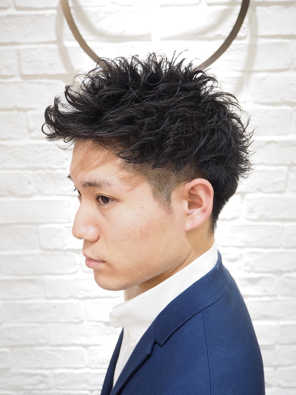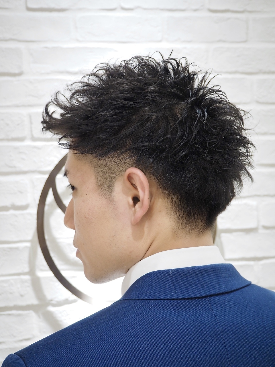 強めに外ハネパーマをかけ、乾かしたときに決まるようにしたジェットモヒカンです!前髪は流せば王道アップバングマッシュにもなるので色々と楽しめます!