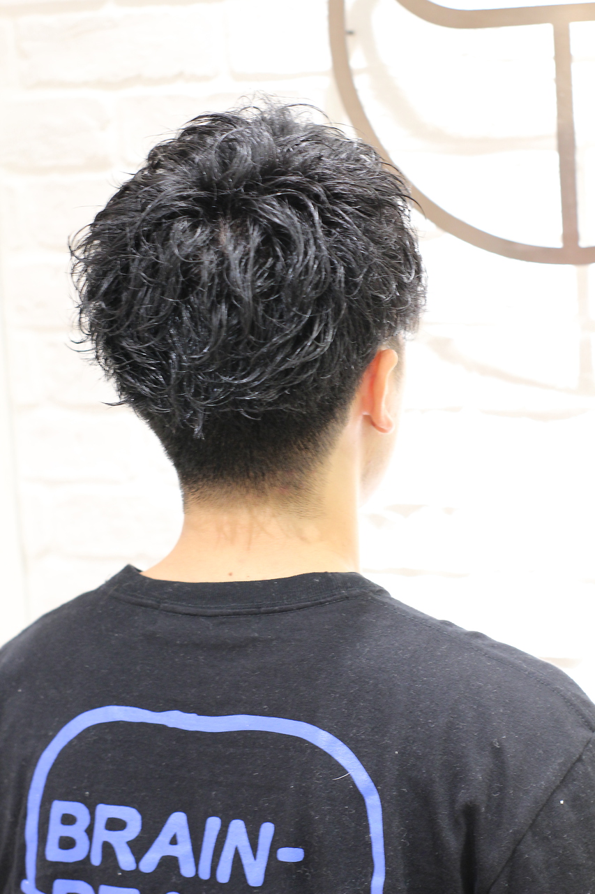サイドにツーブロック、後ろを高めに刈り上げたマッシュスタイルです!パーマでセットが楽になります!黒髪ウェットパーマスタイル人気です!