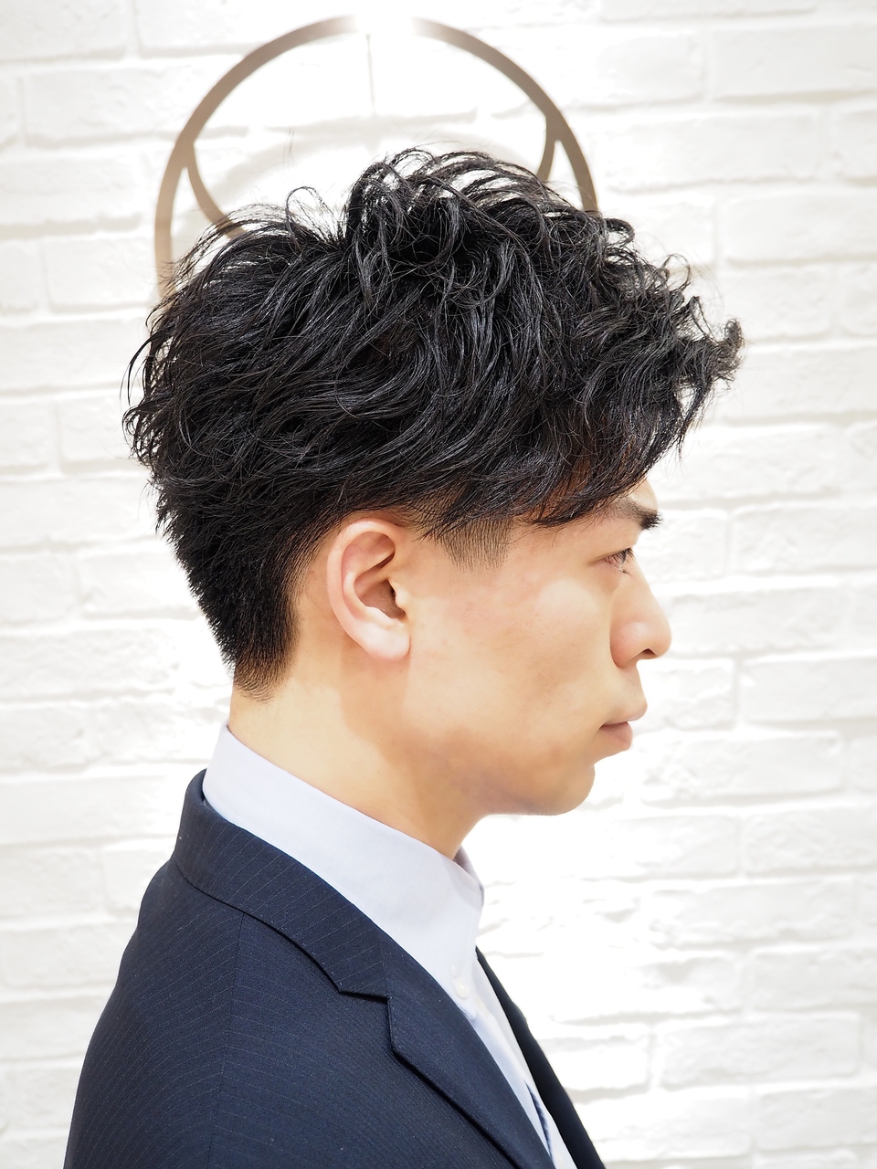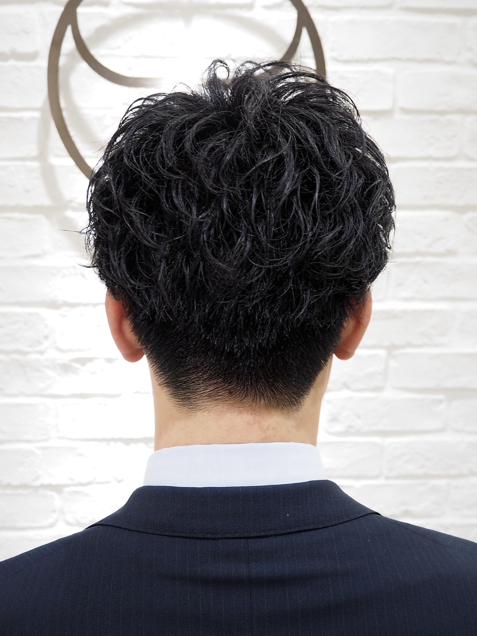 全体スパイラルパーマでアップバングと流れを作りやすくしたリバースショートです!ふんわりしたい時はワックス、タイトなツヤが欲しい時はジェルでのセットがオススメ!