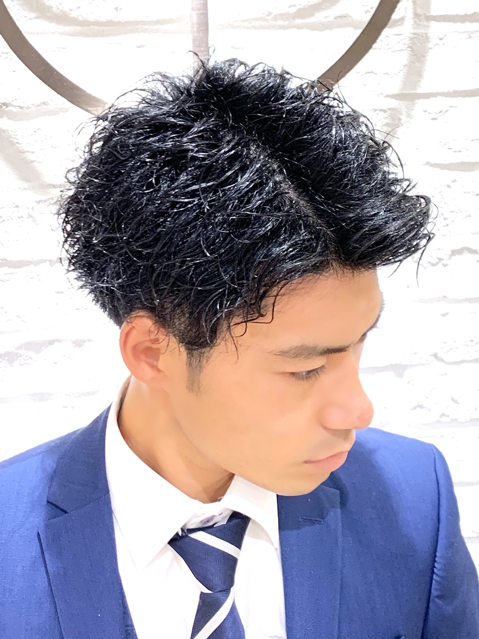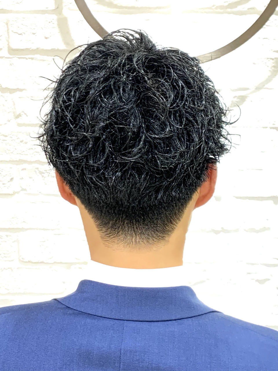 強めのスパイラルパーマをかけたビジネススタイル!大人なパーマ感で、ツーブロックと刈り上げで更にすっきりと!一味違う、【ビジネスパーマ】いかがですか?
