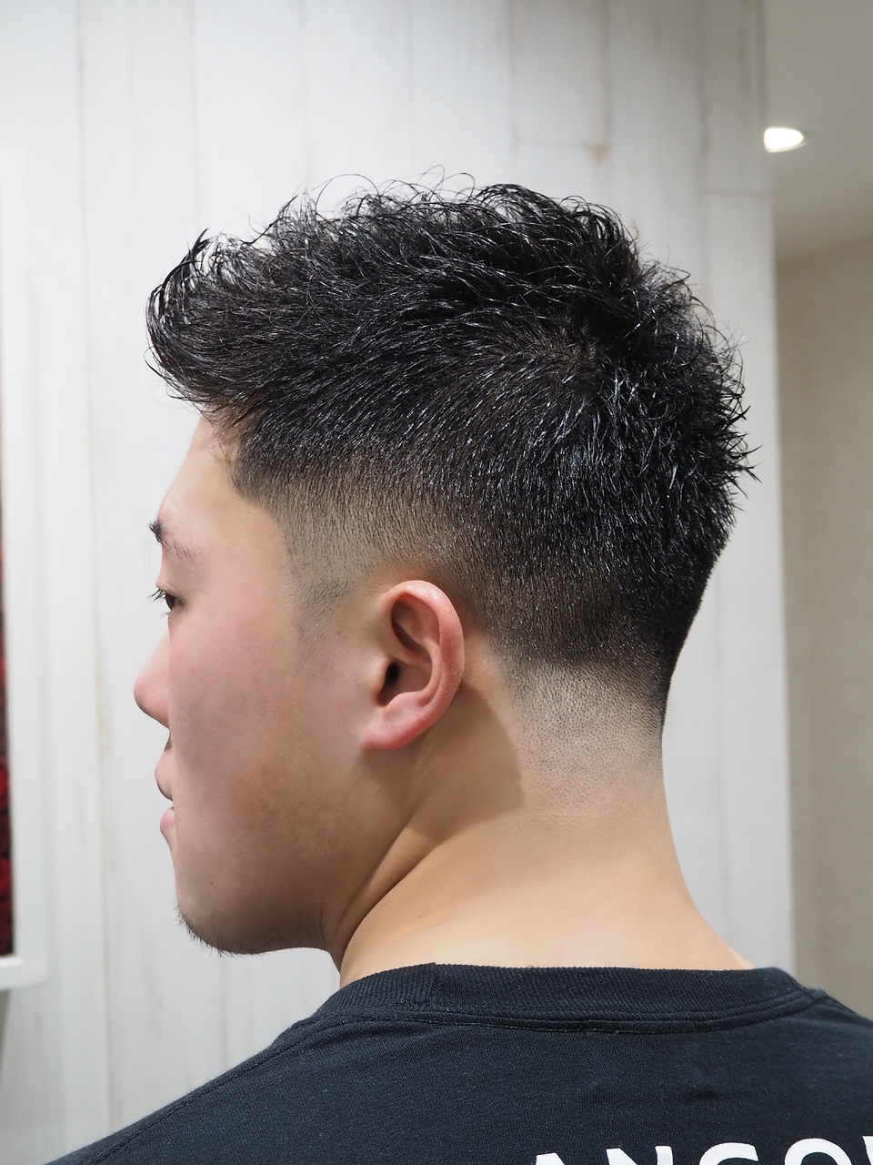 フェードとジェットモヒカンが合わさったベリショートスタイルです!セットしやすいようにアイロンでリバースパーマしてます!ツヤのあるジェルやグリースでセットするとよりかっこよくなります!