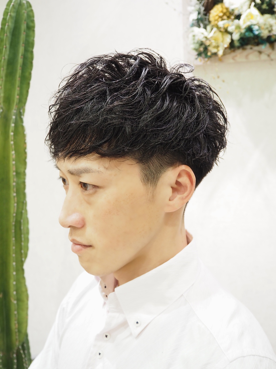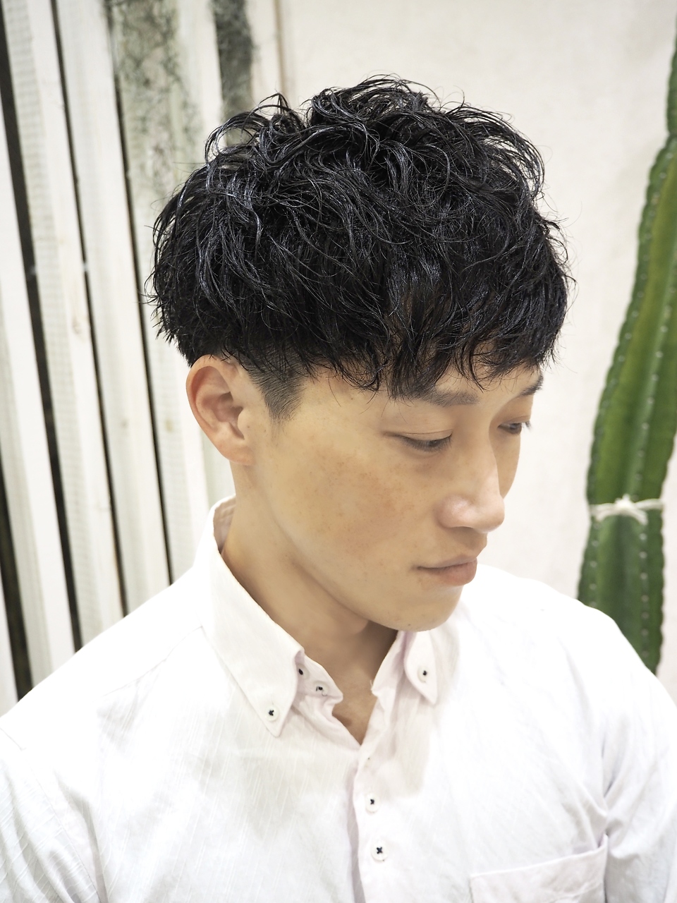 軽いツイストでカールしすぎないスパイラルパーマにしてます!グリースを揉み込むように付けてトップから放射状にほぐせば完成です!
