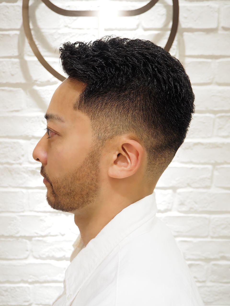 髭からフェードにかけてデザインした、パートスタイルです!ボリュームをだしてセットするため、ワックスかグリースでのセットがおすすめ!