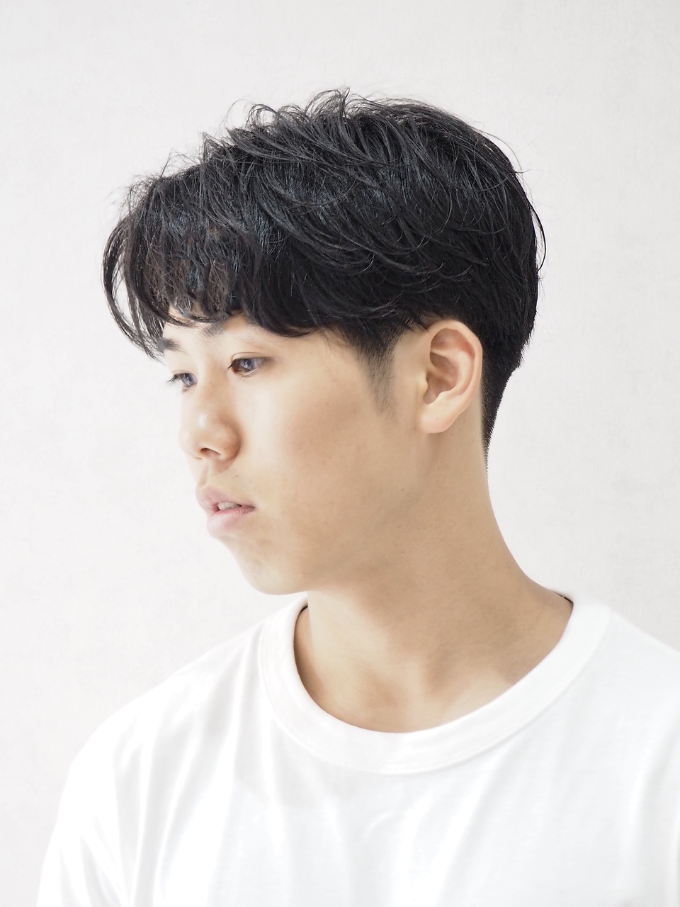 ソフトに前髪とサイドにパーマをかけて、セットを楽にした流行りのセンターパートです!ソフトワックスかバームなど軽めの整髪料で揉み込み前髪のカール感とサイドの流れを作ります!
