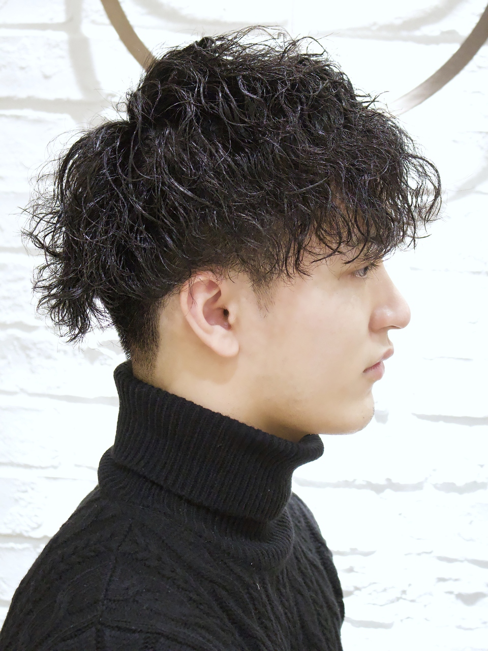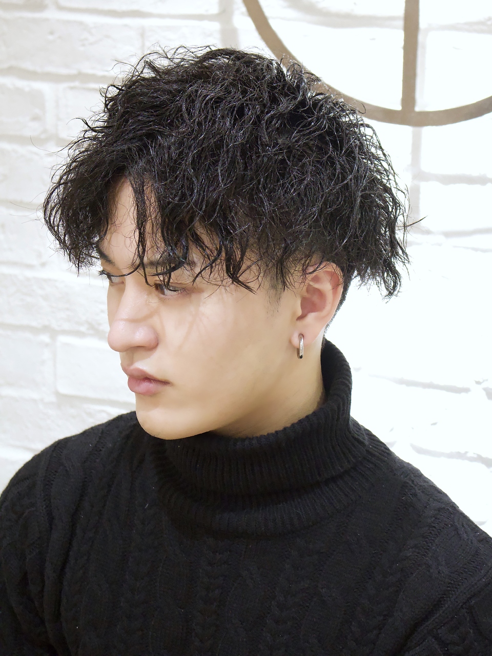 重めのセンターパート風スタイルに波打ちツイストスパイラルパーマを落とし込んだスタイルです!周りは一周ツーブロックになっているのでスッキリとしています!