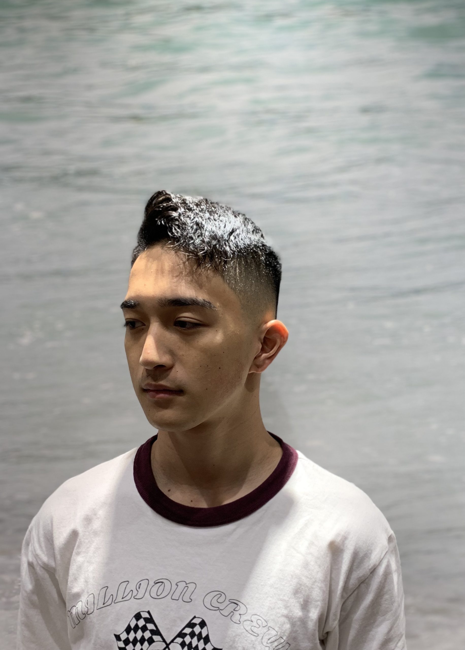 周りはフェードでスッキリとしつつパーマ感のあるフロントの部分を遊ばせて少し崩したスタイルです。