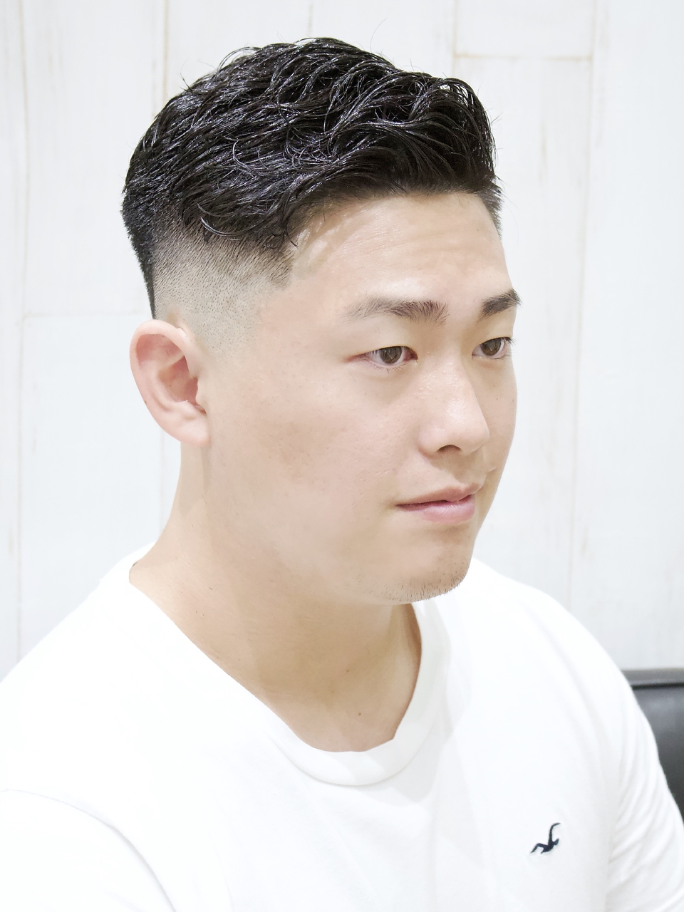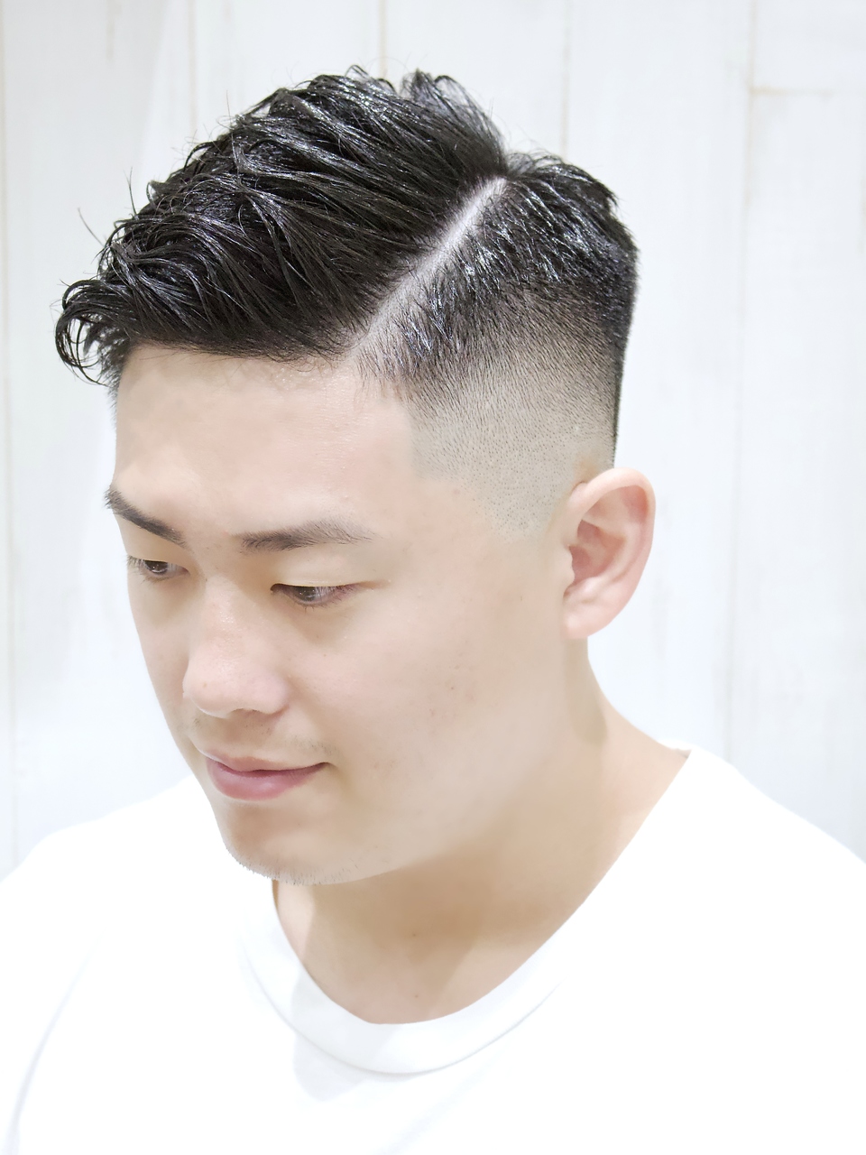 ハイフェードversionのサイドパートにアイロンパーマをかけた小洒落スタイルです!