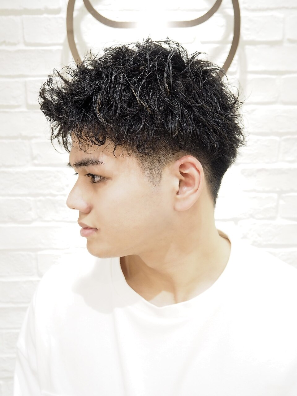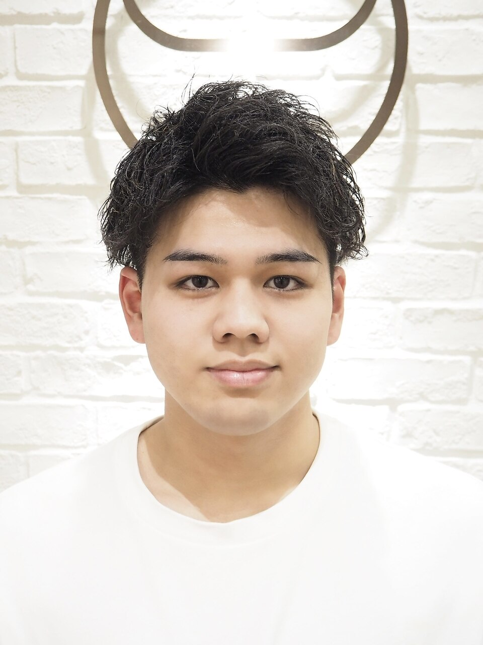 直毛で前髪が落ちてきても、ツイストスパイラルパーマで前髪を上げた無造作な動きで爽やかさ爆発のリバースショートに変身!!グリースをしっかり揉み込んでツヤ感と清潔感を出します!